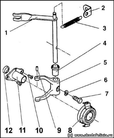 | ребят полез я к лапке тросика и заметил такую штуку что она имеет люфт по боком и верх вниз,отсюда выводы когда нажымаю педаль подшбник не ровно нажымает на лепестки а когда доходит до упора он заскакует по лепесткам на свойо место.Вопрос что имено лювтит в лапке?тулка рычага выключения ?или что то другое подскажыте . 1 — Рычаг выключения 2 — Анкер пружины 3 — Пружина 4 — тулка рычага выключения 5 — Вилка рычага выключения сцепления 6 — Стопорное кольцо 7 — Винт 8 — Выжимной подшипник 9 — Штифт 4х10 10 — Винт 11 — Направляющая цапфа выжимного подшипника 12 — Уплотнительное кольцо